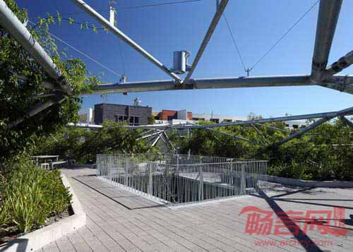澳大利亚Collins & Turner建筑事务所设计了位于悉尼郊区Waterloo、带有植物覆层金属顶棚的青年社区中心翻新项目。项目通过设计俯瞰Waterloo Oval滑冰公园的中央庭院和景观屋顶,为城市住宅和健康机构Weave增建了一个休闲设施。倾斜的框架包含结构杆和金属网,材质是镀锌钢,用来支撑上方的植物。设计师表示,“随着顶棚上的植物不断生长成熟,建筑会与公园背景完全融合,形成抽象雕塑形式的绿地,贯穿公园边界。”