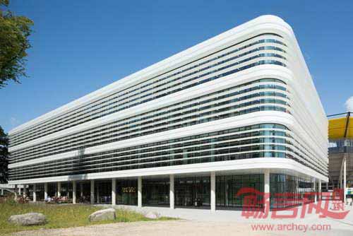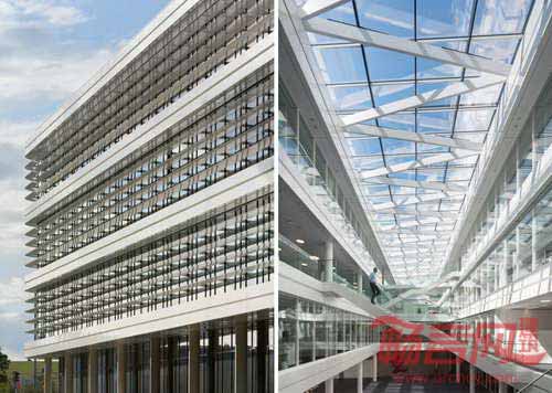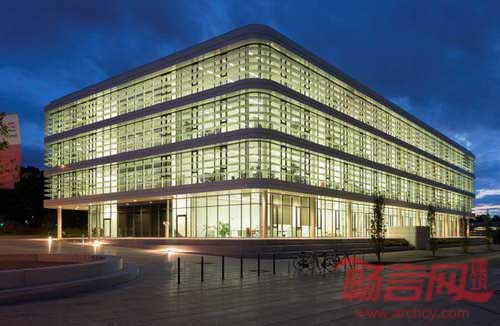 建筑玻璃外立面呈现强烈的横向感,配何醒目的楼面和连贯的遮阳百叶窗。