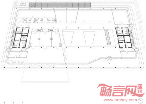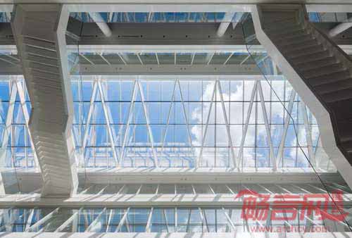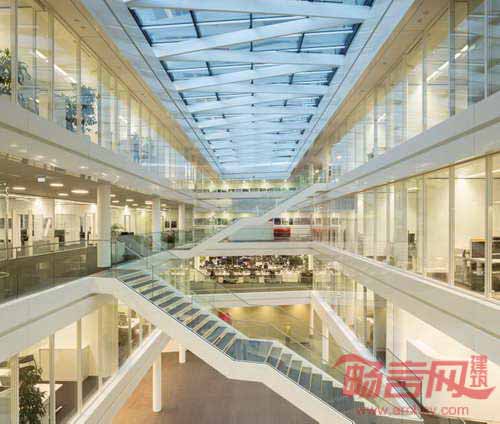 不同的办公设施围绕中庭而设,上方有宽敞明亮天窗。建筑中央设有不规则形状的楼梯,为不同部门和楼层提供直接通行条件。