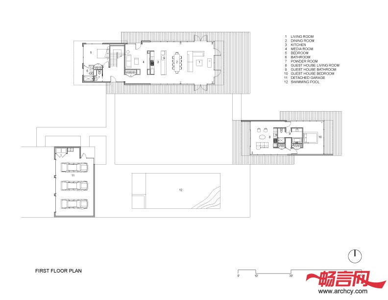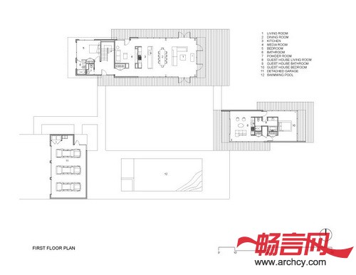 住宅包括三个单独的建筑,分别是主房、客房和独立的车库。这几个房子的朝向保证了住宅室外空间的最大化,而且把自然和人工元素连接了起来。
