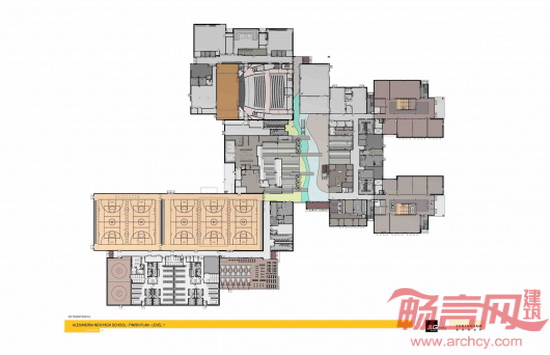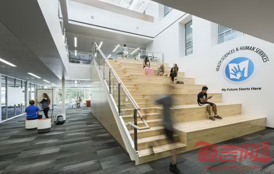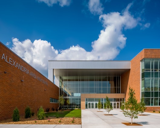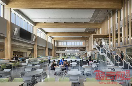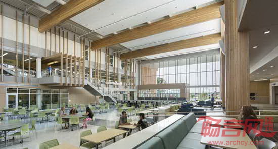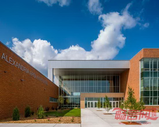 Cuningham设计集团设计了位于美国明尼苏达州的Alexandria高中建筑。这座发展迅速的城市是众多自动包装机械厂家所在地,因而被称为“包装业的硅谷”。同时,十几个湖泊环绕的城市也是著名的旅游度假地。当地工业和城市旅游业在学校设计方案规划中起到重要作用。项目前期邀请了社区的100名家长、学生、教师、商业人士和地区领导,参与项目决策制定过程。
