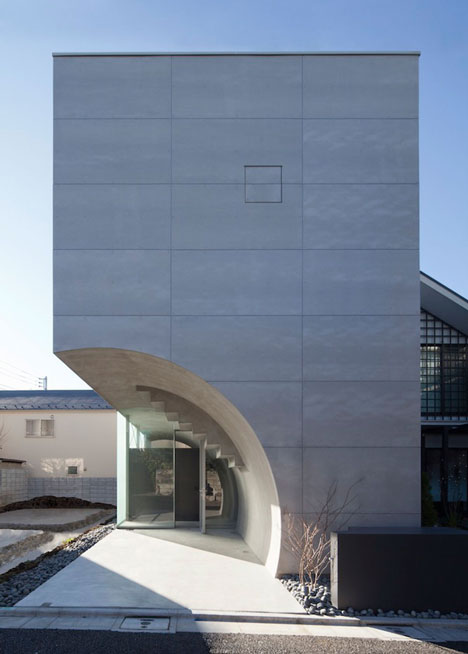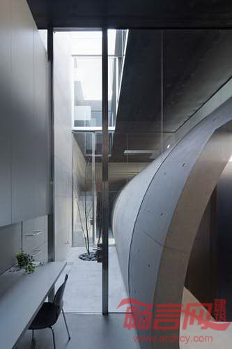日本塚田真树子建筑事务所设计了位于东京的“隧道”住宅——住宅的基底被混凝土隧道穿越,形成外立面上的圆洞,露出下方的楼梯。项目面向丁字路口,设计师创造了一种相当于道路延续的结构。设计结果是一个截断整个一层区域的曲面容器。设计师表示,“设计意图是提供街道的视觉延伸,创造一种交叉结构。”房屋其它部分围绕隧道而设,营造一系列非同寻常特点,包括漂浮的钢板楼面、楼梯下方的餐桌、三倍高院落以及没有天花板的卧室。