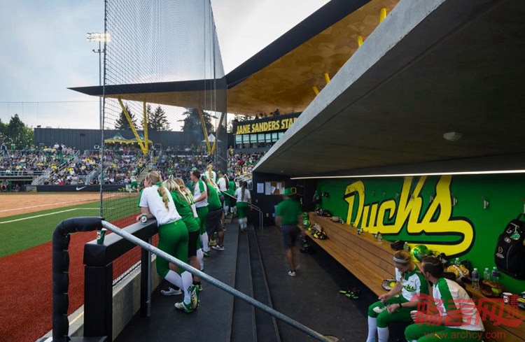 SRG工作室设计了美国Eugene俄勒冈大学Jane Sanders体育场。项目面积19100平方英尺,于2016年完工。这是一个流畅的体育场,是俄勒冈垒球鸭队的主场,体现了力量和能力。场地容纳1500个固定座位,出资人是Robert Sanders,根据其已故妻子Jane命名,设计优雅的融入俄勒冈大学校园肌理。运动场座位区上方标志性高耸的顶棚,契合了垒球队创新的代表精神。