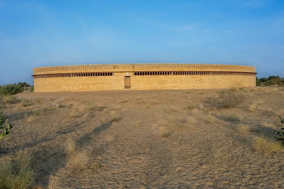 Rajkumari Ratnavati女子学校坐落在印度拉贾斯坦邦神秘的塔尔沙漠中央,其独特的椭圆形砂岩结构与四周干旱而又广阔的景观无缝地衔接在一起。学校将于2021年7月开放,并接收400多名女学生,其学龄从幼儿园至十年级不等。这些女孩均来自当地贫困线以下的家庭——该地女性的平均识字率仅有36%。Rajkumari Ratnavati女子学校犹如沙漠之国杰伊瑟尔梅尔的一座灯塔,它的建立旨在改善当地社区的生活水平。三座建筑落成之后将共同构成“GYAAN中心”。