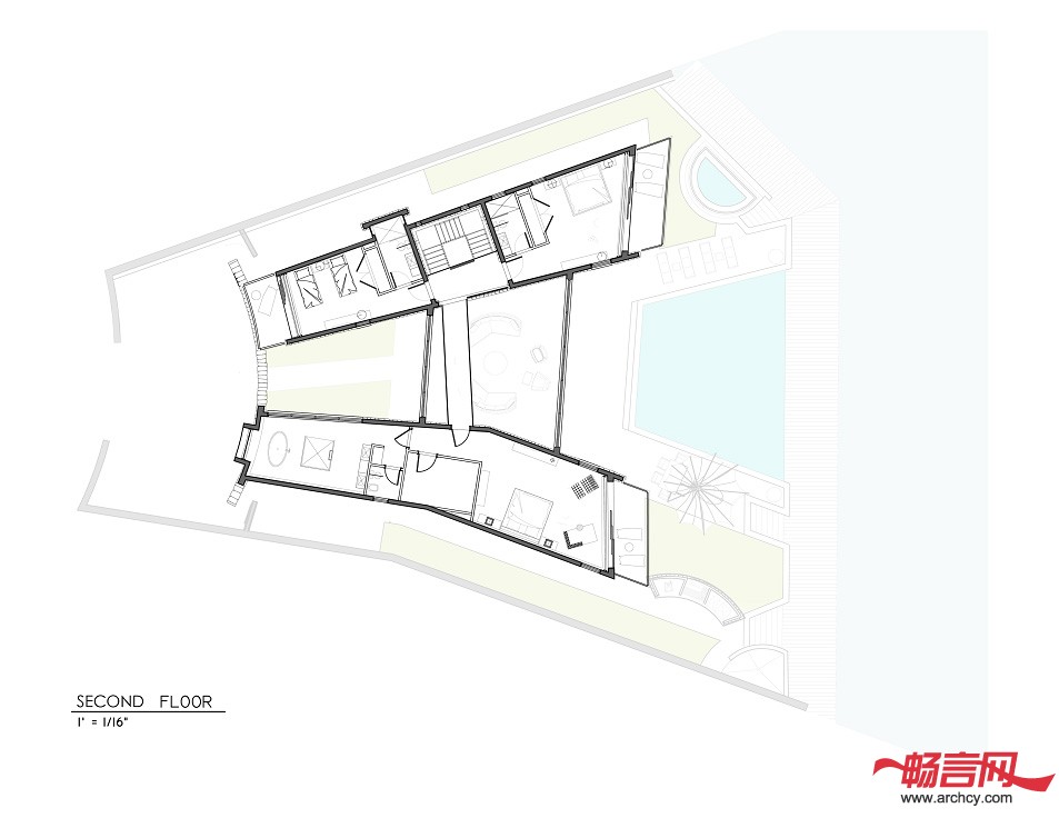 功能分区:3间带有浴室的卧室、一间带有能从房子外面直接进入浴室的卧室、一个书房/电视房(这里也带有浴室,为以后转化成卧室做铺垫)、起居室、餐厅、厨房、车库、游泳池、桑拿房、小船和水摩托停靠台。