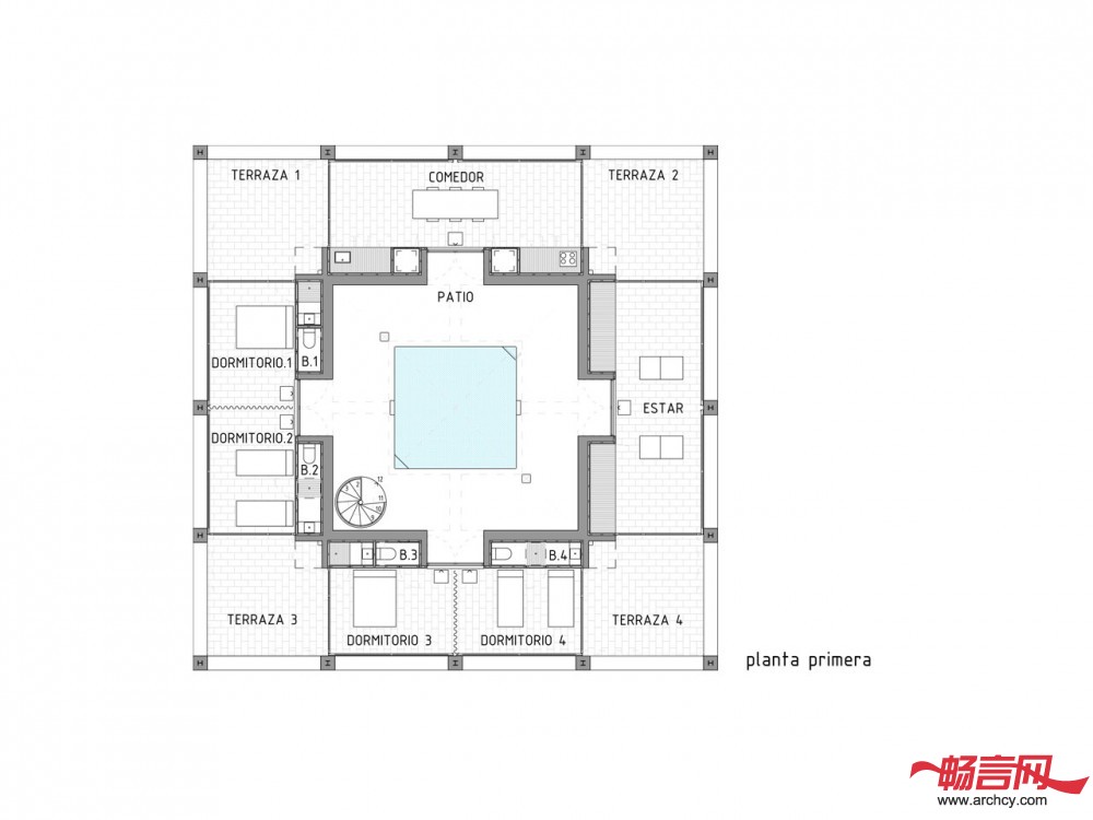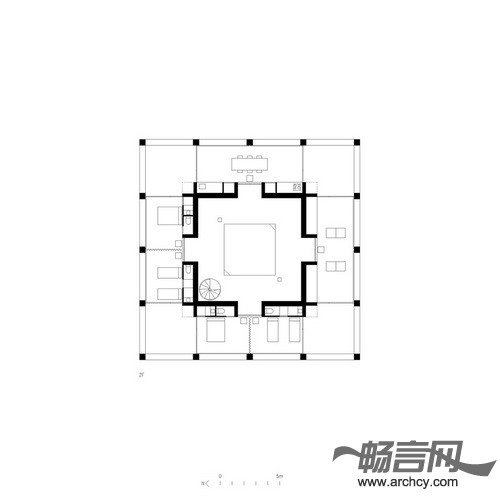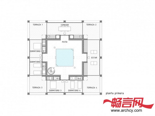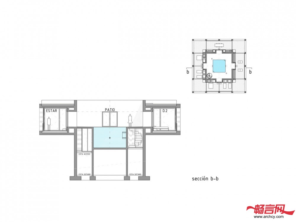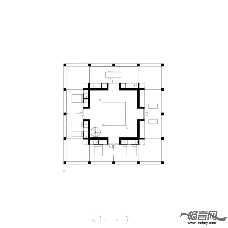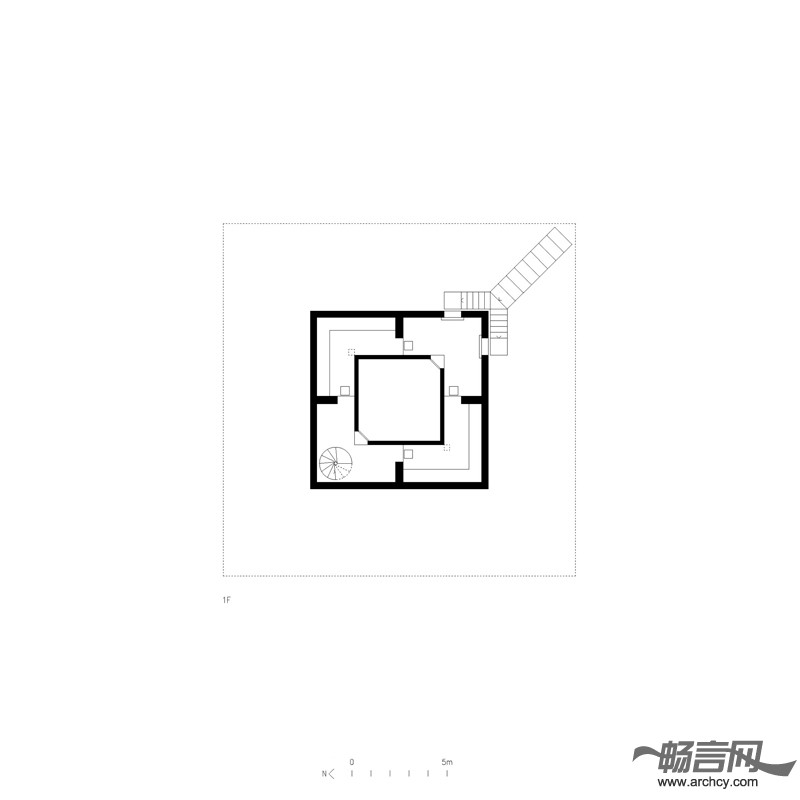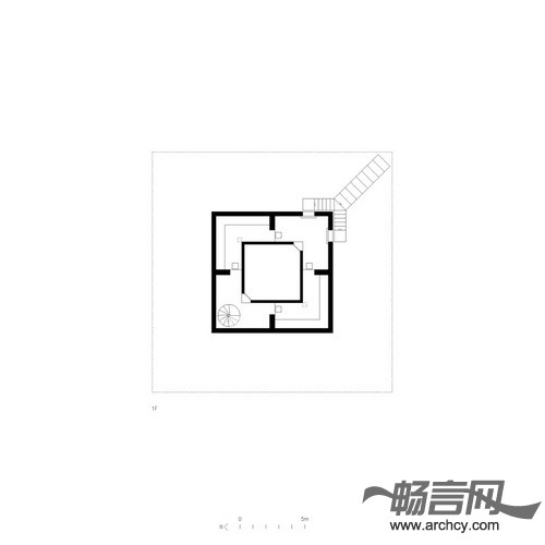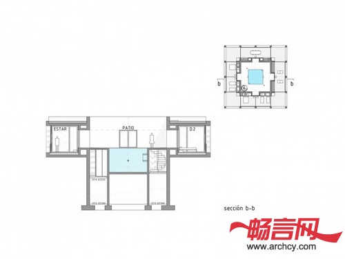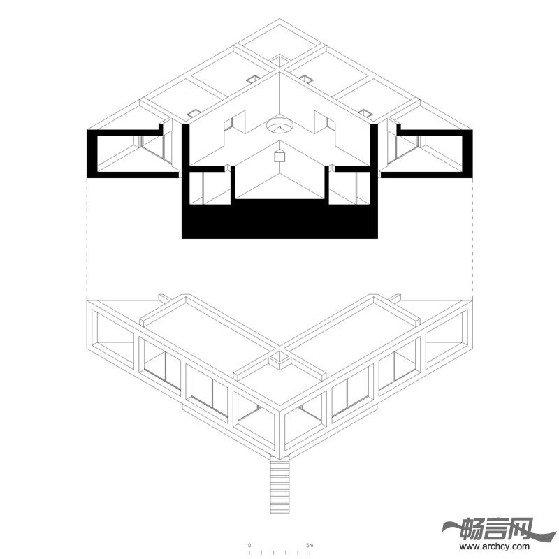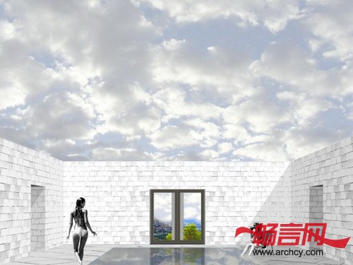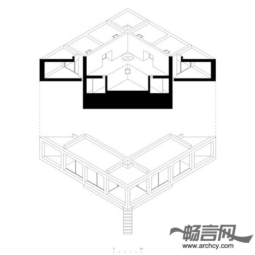 住宅中的门廊作为一个房间显得过于狭窄,作为一个露台又有些深。在空气流通良好的平台中间设有一间单独的内部空间。这个空间没有房顶,并且它的四个方向没有任何阻碍,可以使使用者观赏四面八方的景色。它的中间设有一个尽可能深游泳池,同时将这栋住宅与地面分离。在这个天井泳池里,你可以经历飞天入地的奇妙旅程。