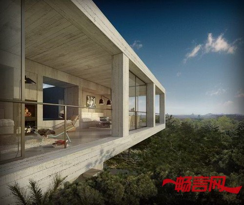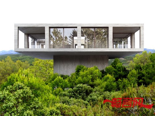 这座建筑在建筑环境中非常显眼。它是一栋从地面升起的水平建筑。隐秘的建筑墩座支撑了住宅庞大的镂空结构。从远处便可以看见这栋住宅悬在半空的部分,而另外一部分则隐藏在茂密的枝叶中。从悬在半空的部分,你就可以知道住宅的朝向 --- 四面都是开口的。在这个四方形的露台里面,是由随意排列的16根柱子支撑的方形大厅,大厅里面有功能各异的房间。明亮、相互对称的各个房间从带开口的拐角看,效果更加明显。