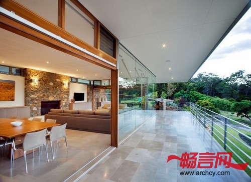 主起居室是一个大的玻璃空间,位于一个卧室套房的上面,这个卧室套房是用大块石头建造的,它嵌入到了小山里。这样的布局保证了最好的隔音效果和隐私,上面进行的活动就不会影响到这里。主卧套房位于住宅的一侧,它穿越过了主起居室,也与位于西侧庭院的车库和洗衣房连接了起来。入口位于这几个空间的交汇处。