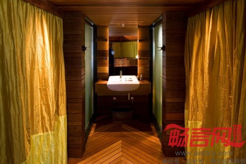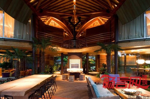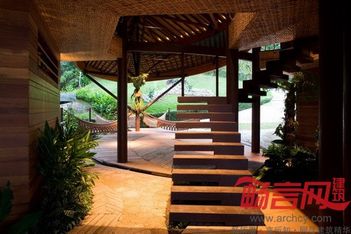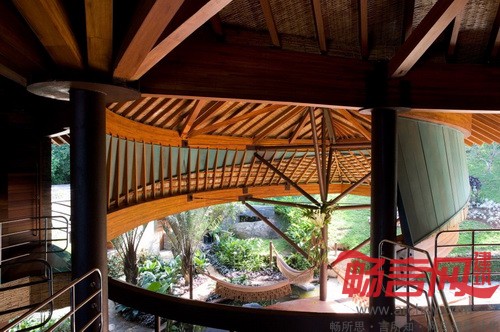 别墅的底层空间到处都是迷人景色:狭长的游泳池蜿蜒进入屋内,从餐厅下方穿过,最后汇入别墅后方的水塘,水塘里还养殖了很多水生植物和鱼类。水塘的旁边还有一个休闲游廊,那里设有5张巴西印第安风格的吊床。