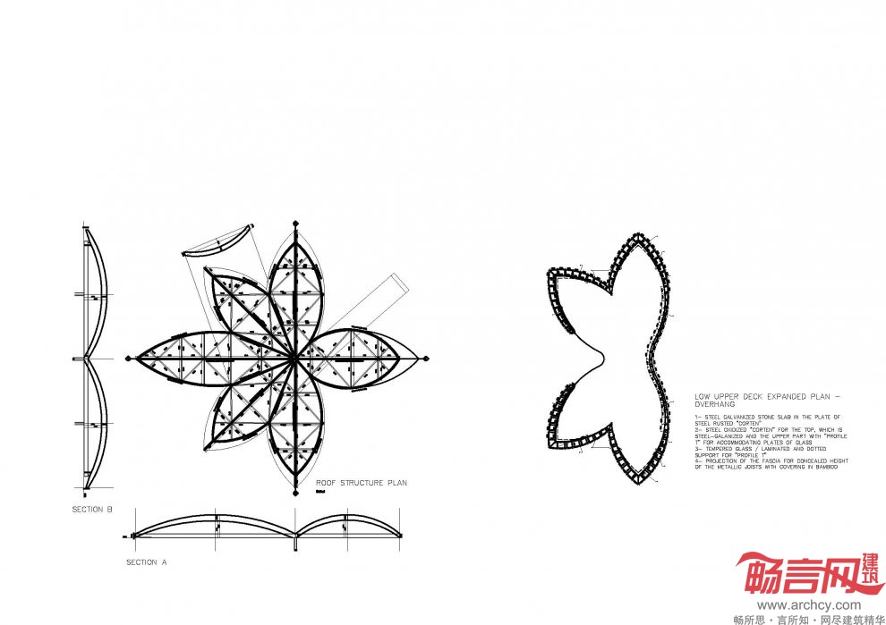 屋顶的框架选用的是层压的桉树薄板,这些层压薄板能够适应很大的搭建跨度(该别墅叶状屋顶的最大跨度为20米),而且还能体现精妙的美感。屋顶铺设的是块状松树板,因为块状结构更容易适应屋顶框架的复杂形状。另外,屋顶中央还有一个钢制容器,用来收集从屋顶流下的雨水,这些雨水可以用来浇花和冲厕所等。