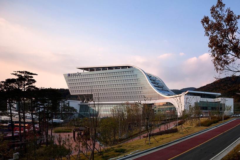 SAMOO建筑事务所设计了位于韩国大邱的KOGAS天然气公司总部。建筑共有11层,设计理念围绕“生态飞船”展开,呈现出简练、高效的方案。设计目标之一是将多种可持续科技融入建筑之中,例如地热科技、太阳能光电、自然通风和光伏一体化。室外特色是建筑的动感坡屋面,这一设计模拟了能源的流动,达成了景观和建筑的平衡。
