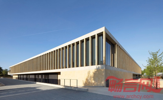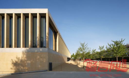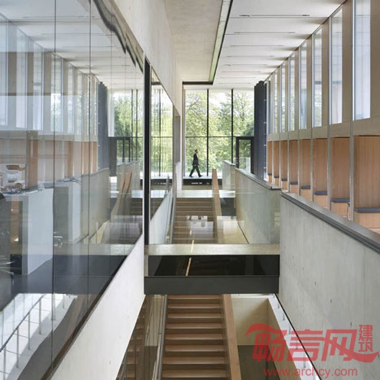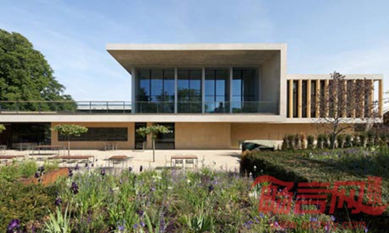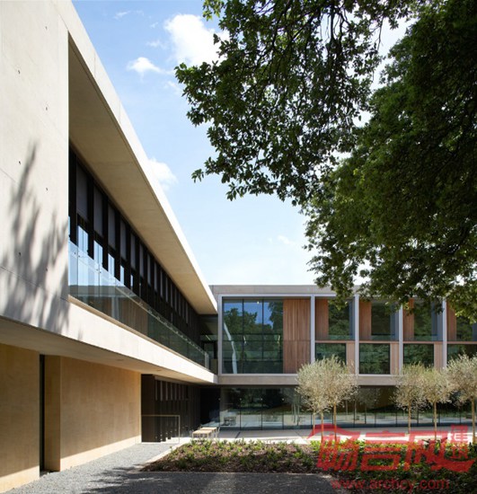 建筑作为环境的一部分,地上两层加地下一层,一方面确保对环境的有效控制;另一方面降低了建筑高度。由此,在整体效果上实现了强烈的水平感。材料方面使用了石灰岩和清水混凝土,体现出坚硬朴实的质感,让人联想到地层物质,感受到达尔文的进化思想,也符合人们所期待的大型研究中心的永久状态。同时,对建筑和花园在实体和视觉上的渗透于联系是概念的核心所在。
