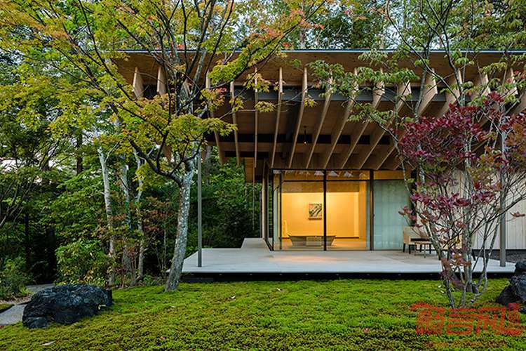 隈研吾事务所在日本森林环境中设计了一座宾馆建筑。设计对周边自然环境的影响降到了最低程度。坐落在长野轻井泽的浅间山上,这里是活跃的鸟类栖息地。设计师巧妙地将鸟类特征融合到方案中,达到了自由轻盈的目的。为了营造通透建筑结构,设计师采用了一个实心铁柱之城的木头屋面。他将这种选材形容为,漂浮在森林之上,室内开放式布局,和周边自然环境也没有隔离。