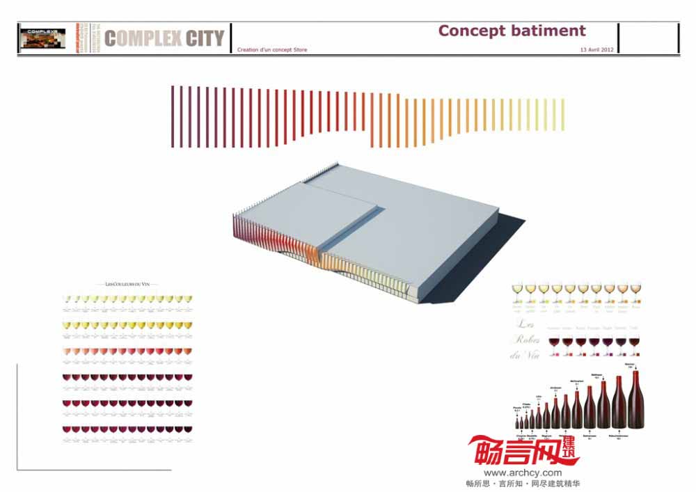 建筑的渐变色彩代表了葡萄酒的主要种类——白葡萄酒、红葡萄酒、粉红葡萄酒,同时符合常识概念以及美学、象征和想象力方面的特点。