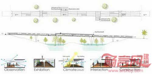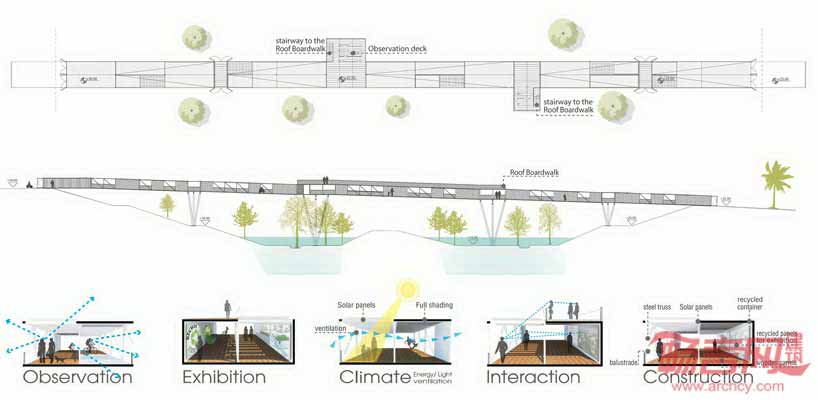 公园运用了回收集装箱,相较于传统的连接意义,更注重空间改善功能。集装箱改造非常快捷、省力,采用了场外施工和后期安装方法,降低了损害性施工影响。集装箱和新钢铁横梁相结合,构成了桥梁的主要部分,而两个悬臂瞭望台为人们提供了观景场所。