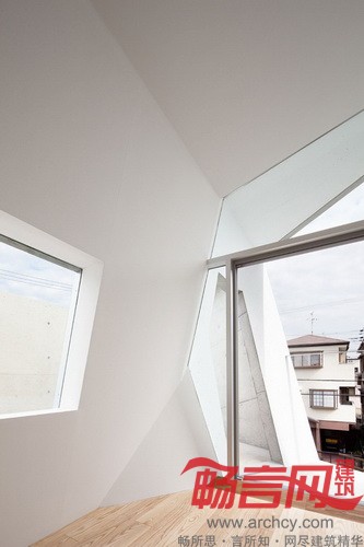 房子的整体外形被“挤压”成一个平行四边形,这样就能与周围的建筑拉开一定的距离。房子中央的一面墙壁斜跨整个地基,将1楼空间按对角线划分为2个区域,这面墙折叠向上延伸,到了3楼又与地面形成了平行关系。各层楼板似乎是跳跃向上的,而且屋顶也是倾斜的。人们可以顺着曲折的墙壁来到房子里的各个角落,感受多样化的空间结构。