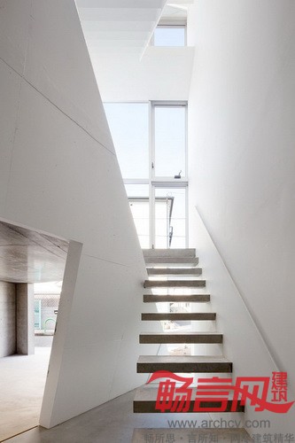 房子正面的东部有一条“裂缝”从1楼一直延伸到3楼,这样就形成了很好的室内采光条件,使曲折的墙壁在光线的反射中显得格外漂亮。当自然光线充满曲折的室内空间时,会给人带了一种仿佛置身室外的感觉。
