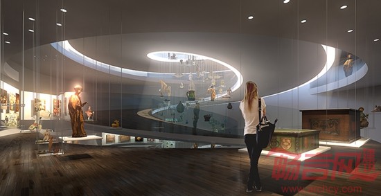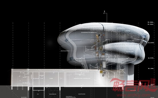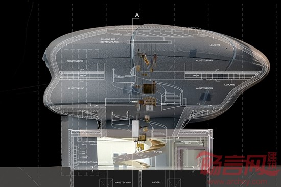 方形的底座是原地浇筑而成,内设门厅和用于展示、接待和工作的多个房间,可容纳近120名访客。底座上方的圆形结构铺设有不锈钢墙面板。展示区的内部设计遵循了“藏珍阁”的理念——这一理念可以追溯到巴洛克时代。通过一个盘旋而上的楼梯,访客不仅可以到达上层,还可以从不同的角度观看展品。