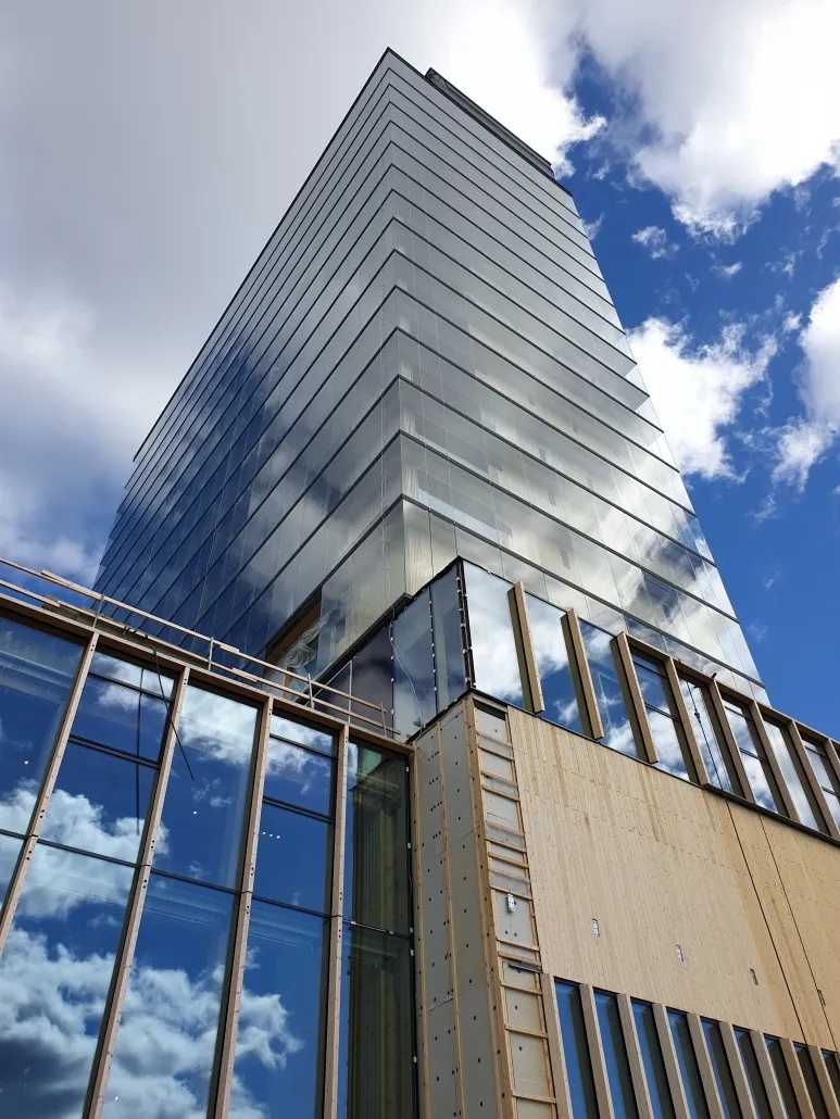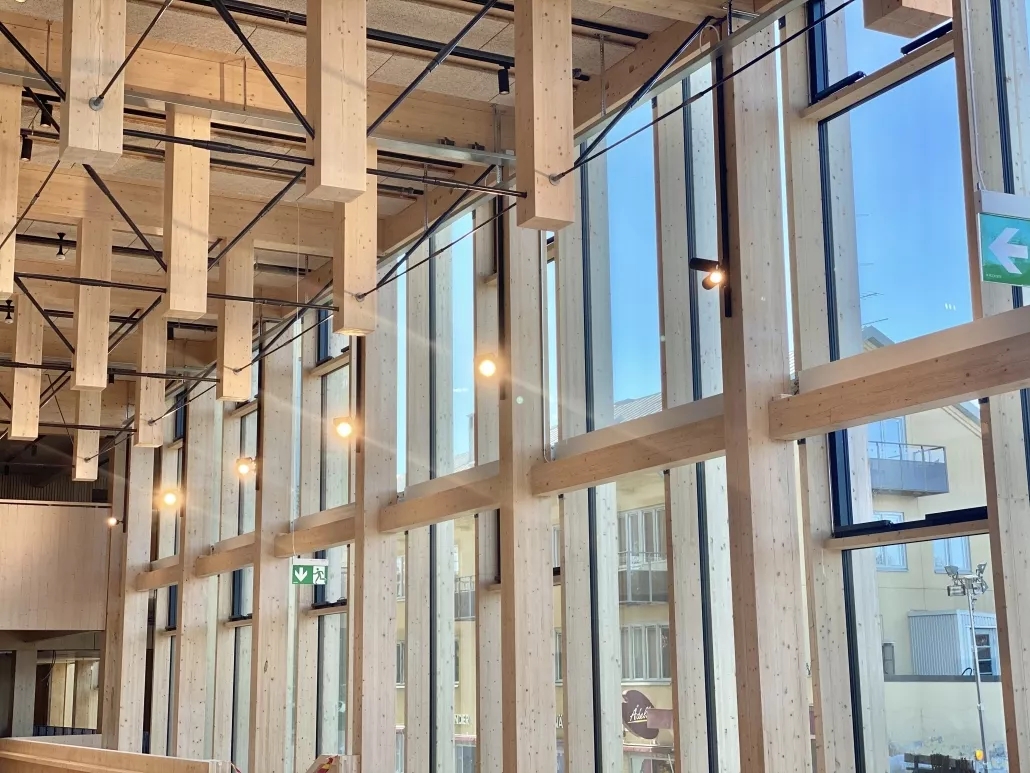 近日,White Arkitekter建筑事务所建成了世界第二高的木结构建筑Sara Kulturhus中心,这是一座终身负碳排的建筑,高75米,只比挪威85米高的Mjøstårnet大楼矮10米。