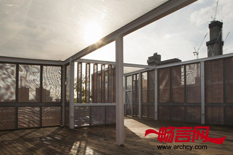 “空中之屋”用定制的钢作为框架,铜网丝作为幕墙,落叶松木作为地板,六块塑料板作为屋顶。