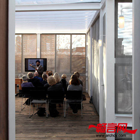 近似于一个小剧场的面积使人们可以对“空中之屋”进行多种不同的布局。四个从庭院里延伸出来的房间会是绝佳的会议和休闲地点。南面是一个百叶式外墙,墙外有一株黑山茱萸的大树,秋天,它的叶子是紫红色的,但最后叶子会变成绯红色的,使屋顶成为一个天然的宜居地。