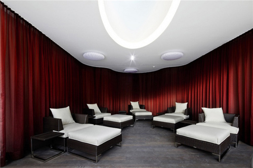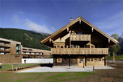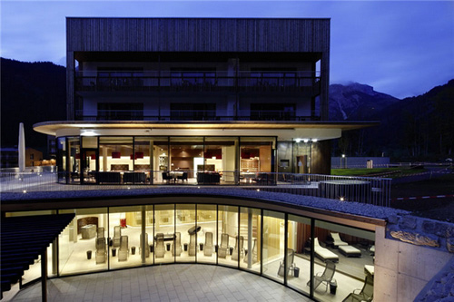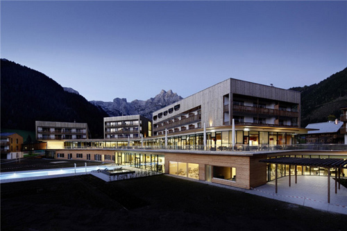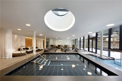 酒店设有一个巨大的地下区域,整个地下室被粉刷成白色,透过曲折的玻璃立面正好可以欣赏到山间的迷人景色。另外三个住宿区包括120个不同的住房类型。这三个区域采用了单侧倾斜式屋顶,上面覆盖有落叶松木板。三个区域所处角度完全不同,使居住在其中的用户可以体验到不一样的风景欣赏体验。酒店内最下的房间布局包括一个浴室、独立卫生间、舒适的床铺、玻璃自动滑门和带有两把躺椅和一个小桌的阳台凉亭。与酒店相连的住宅与酒店具有相同样式的屋顶。