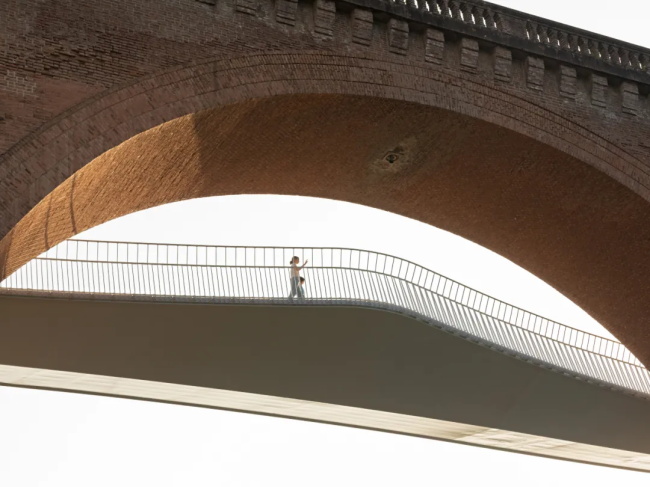 比利时建筑工作室 Ney and Partners 在法国阿尔比建造了一座蜿蜒的人行天桥,该天桥悬挑于塔恩河上一座 19 世纪的高架桥上。这座砖石高架桥建于 1865 年,服务于一条仍在运营的铁路。