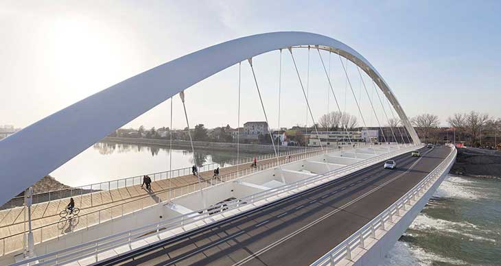 Cittadella大桥长185米,位于意大利Alessandria,替代了拿破仑时期的旧桥,后者在94年洪水中被冲毁。新建大桥跨越了整条河流,由Richard Meier事务所设计,和Gobetti广场一道,城市期望激起对于城市保护的重视。设计师表示,在接受了委托的20年后,我很高兴这一链接新旧城区的桥梁最终建成,将城市的过去和外来贯通。新建大桥不仅仅是一个枢纽;还是一个公共空间。由于旧桥交通常常阻塞,对于行人几乎没吸引力。因此,新建筑将步行道和车行道分隔开。两侧由高高的钢铁拱廊分开。拥有这座壮观的大桥,城市希望能赢得更多的国际关注度,并实现复兴。
