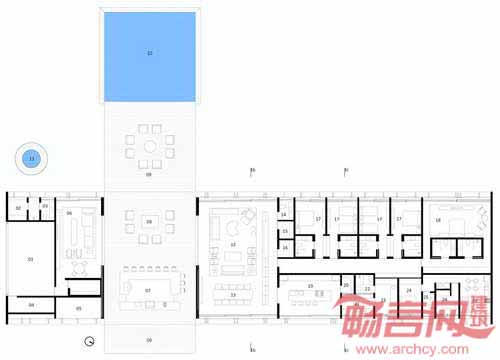 所有私密的卧室都位于东立面,面对美丽的峡谷,对面是管家卧室和社交区域,之间由一条长长的过道隔开。坚实建筑体与长形木质露台结合之处,空间的室内外属性变得模糊,那里兼带烧烤、酒吧和休息功能。公共起居室和电视休闲房位于露台两侧。
