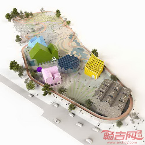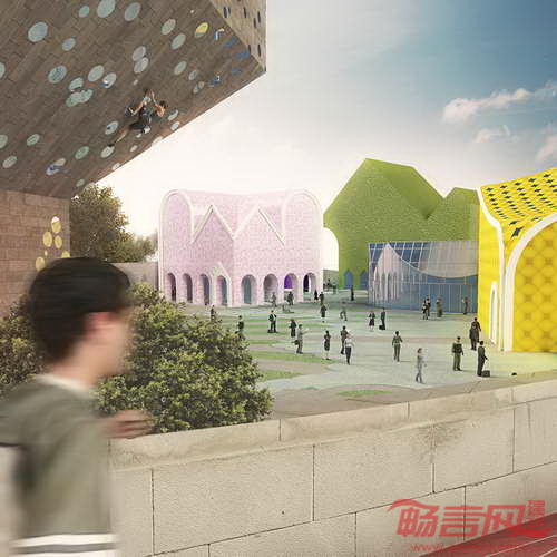 项目采用当地方言建筑形式,使建筑抽象性融合进当地常见建筑形式之中。项目场地中央,高耸的建筑屋顶如同高山般雄伟,同时外形表现出有趣诙谐性。