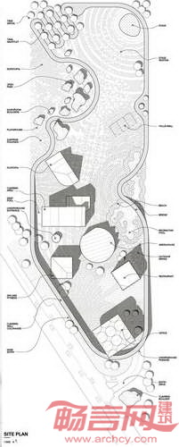 六栋主要建筑包含办公、理疗、健身、餐厅、温室、攀岩墙。建筑地下层设有多功能大厅和停车场,将不同建筑连接起来,使车辆容易进入。