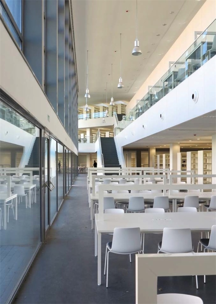 研究室和办公室位于教学楼中的塔楼部分,与其环绕的街道使得塔楼的形象更为明显,项目同时亦是对设计团队提出的整体规划的一次实践。因此,在建筑纵向的末端,长条形的建筑体互相连接,并在人流通道部分开始作出形式上的变化,直至办公室塔楼,形成独特的造型,以此代表学院的形象。