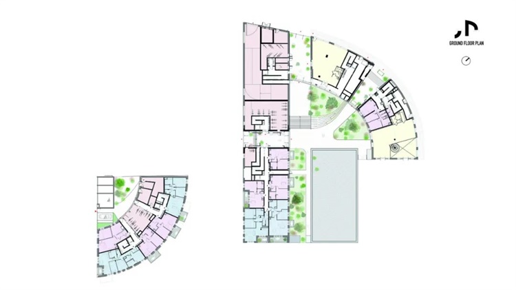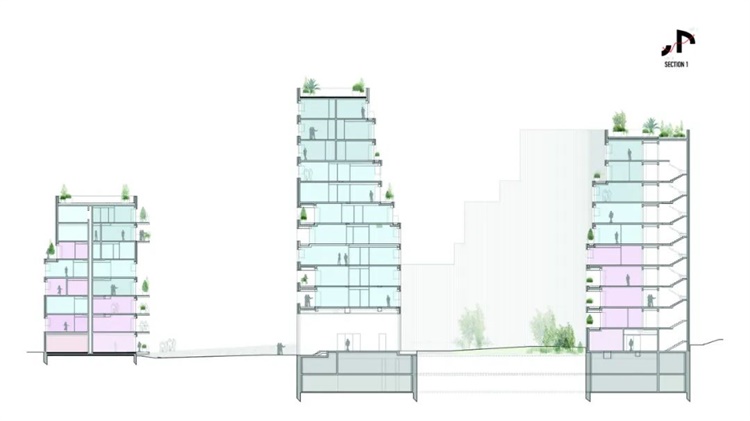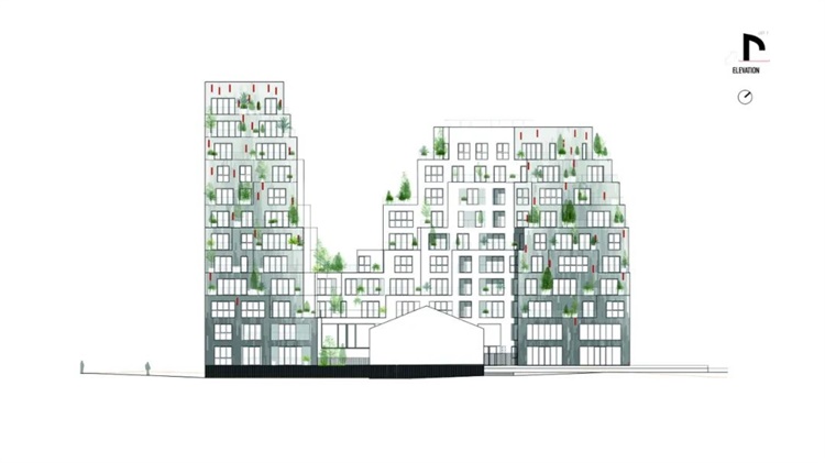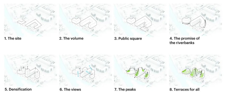 设计从地质构造中汲取灵感,两座立面弯曲的建筑一大一小,从河面向屋顶倾斜,以获取更好的城市视野。这些逐渐后退的梯田布置着充满绿色植物的花盆,将河岸葱郁的绿色景观向上延伸,直到建筑顶层。在两个建筑间的一个种有果树的花园,也强化了这一绿色氛围。