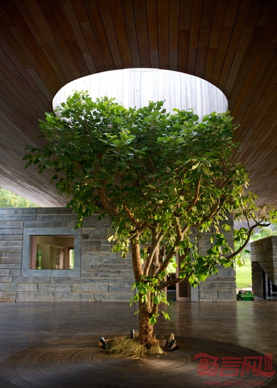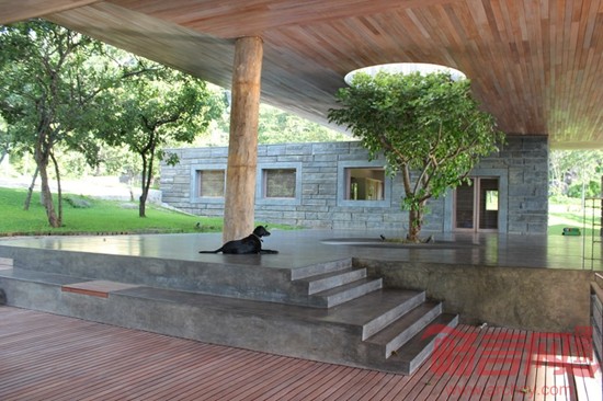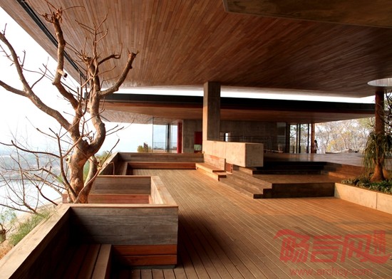 房子建筑面积为1500平方米,房子夹在三层混凝土板之间,混凝土板由模板包覆,房子整体就像一个三明治一样。凸出的屋顶还能为主会客空间遮挡强日光照射。