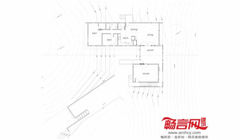 房屋的混凝土基础上安装了结构保温板,支撑了两个主要建筑体——一个在环境景观中水平伸出,另一个则竖直建立。两个建筑体之间通过一个带有钢网的走廊连接;建筑的内外表面使用了当地出产的木防水材料、雪松和冷杉,入口玄关处下使用了胶合层木横梁。