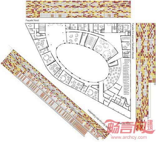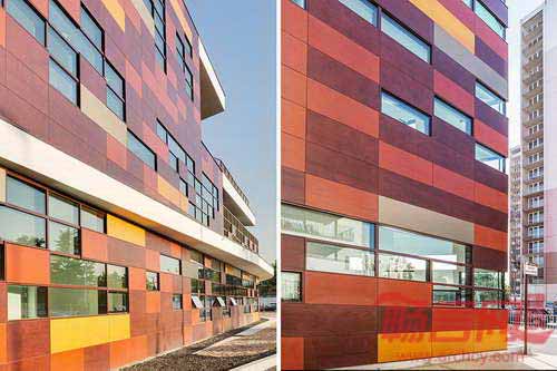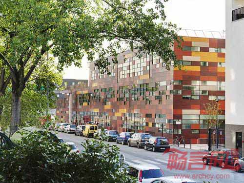 Boligny学校综合体位于巴黎郊外Bobigny区域的一块三角形场地上,项目由Mikou工作室设计,目前已经竣工。工作室在2009年一次设计竞赛中赢得项目的设计资格,场地紧邻三条喧嚣马路,建筑朝西临街面有两层,北向、东向分别是三层。彩色窗户和木板的格栅结构创造出大规模马赛克效果,色彩从深红到亮橘色,使建筑在周边环境中凸显出来。场地周围分布了主要入口、休闲中心、图书馆和公共区,覆层对这些区域起到了保护作用。靠近人行道的立面高度逐步降低,形成螺旋效果,使整体量感更为柔和。