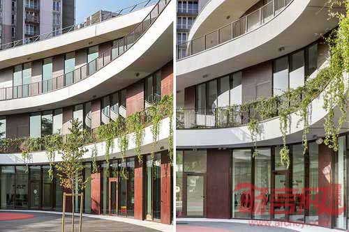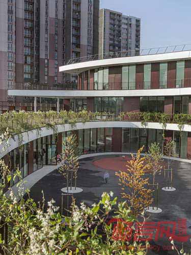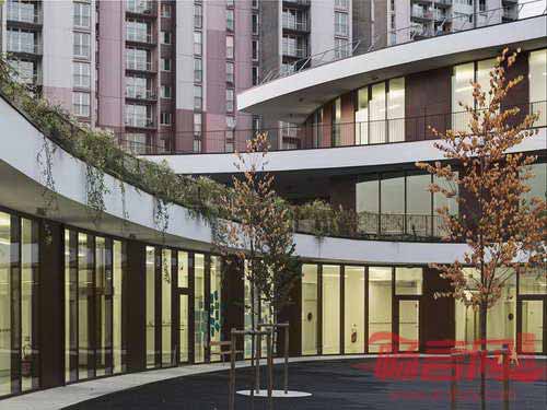 为了回应城市文脉,外墙高度对中央庭院中玩耍的儿童起到了隔离保护功能。暖和的阳光进入梯状楼层中的教室。绿化区和阶梯露台营造出城市景观中的绿意盎然的氛围。