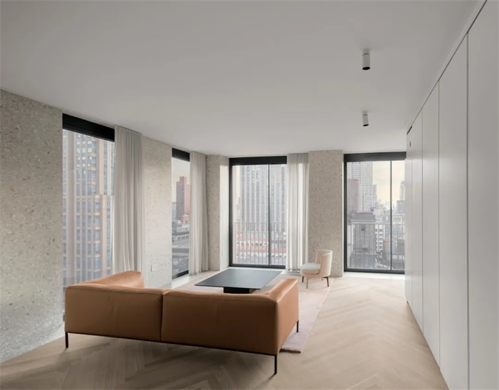 建筑师在公寓内置家具的设计中藏入了必要的存储空间和家具电器设备等,从而减去了室内空间设置隔断墙的必要,打造了一个更易于观景的室内居住环境。建筑师还给每一间住宅配备了顶天的全层高玻璃窗户,顶层的两间住宅还设有额外的廊柱露台,以最大程度地给内部住户提供欣赏纽约城市天际线的机会。