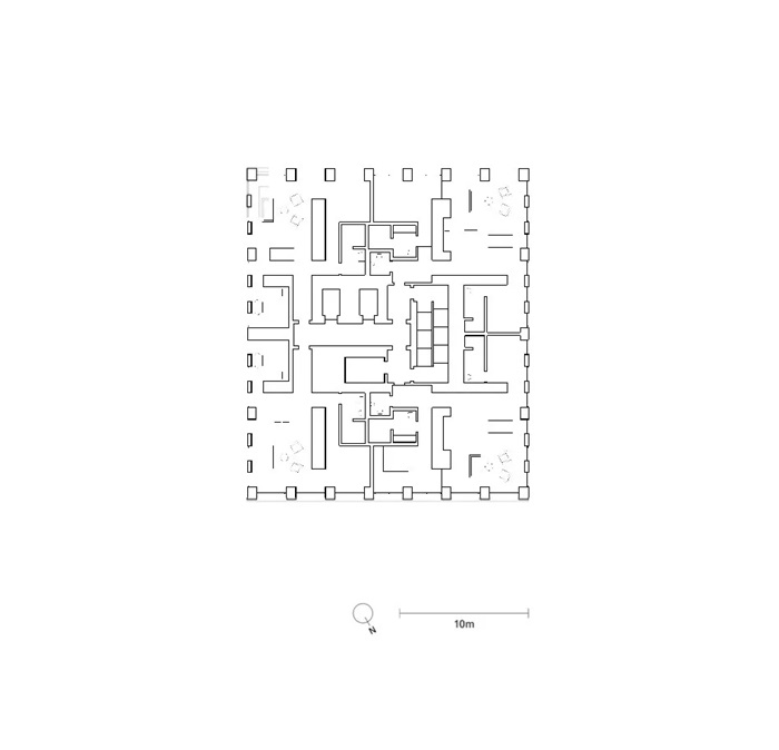 塔楼的立面设计还充分考虑了周边历史建筑的既有肌理。立面所用混凝土混合物内包含的不同物料均可在塔楼相邻建筑物的砖砌外墙中找到对应物。同时,建筑师还在抛光预制混凝土板和柱子网格模数的处理上参照了传统的技术手法,使新建塔楼能更好地融入该项目所处的街景语境中。