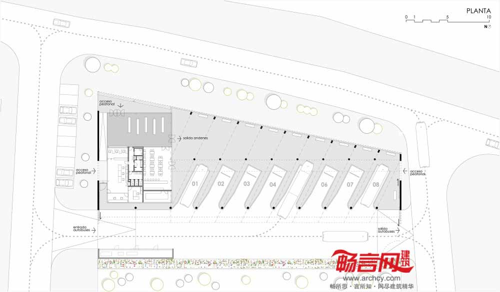 建筑分为三大不同区域——公交区、室内候车区和室外候车区。