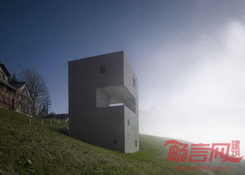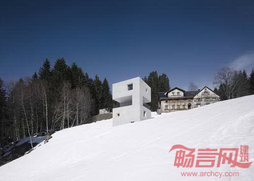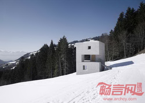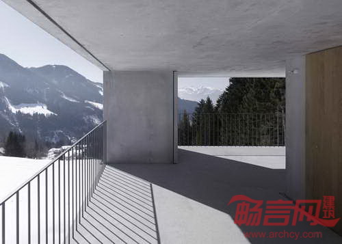 M&M建筑事务所设计了阿尔卑斯山麓的一栋混凝土小屋。四层的山间小屋位于奥地利Laterns,最大的优势是拥有风光迤逦的森林美景。两个巨型结构环绕了线性建筑体,将之一分为二,并营造了二层以上的户外露台。从建筑背面的楼梯可以进入房屋内部。