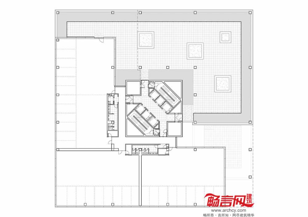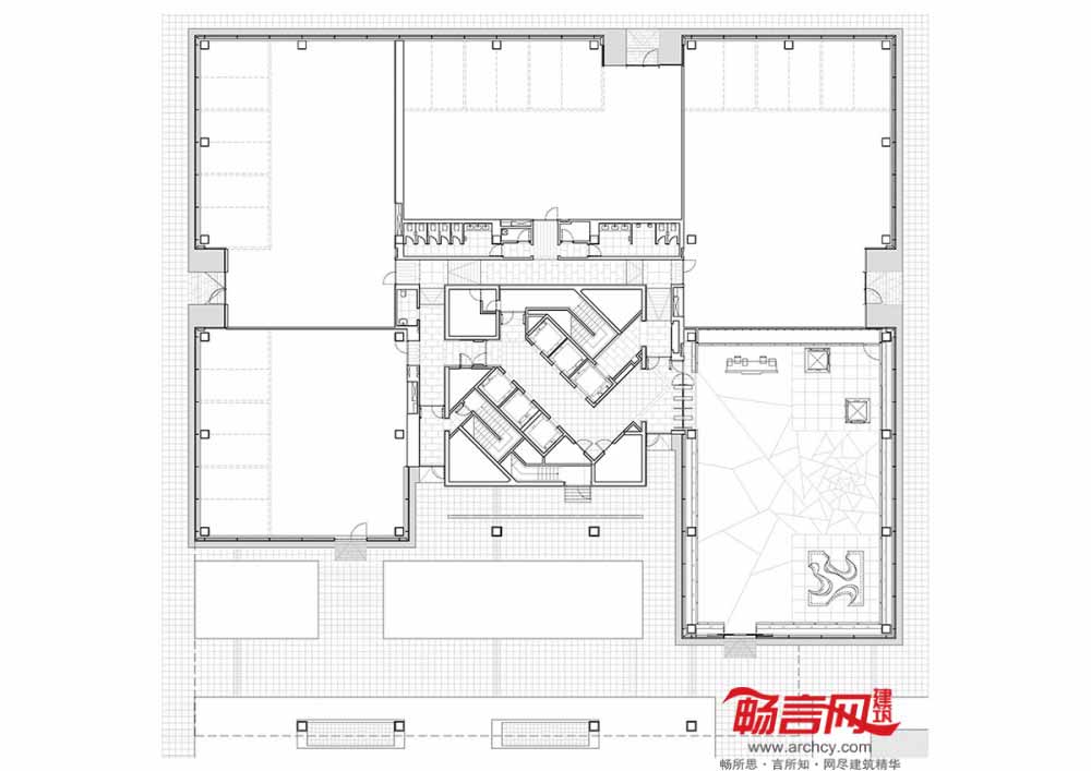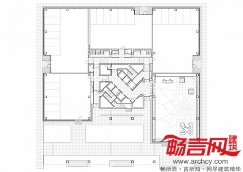 由于建筑的办公区域的最终用途尚不可知,设计师采取了开放式方案,允许空间的后续规划和改动。场地面向步行街区的代表部分,以此为参照点,用网隔开了一个7.5*7.5米区域,从这个位置将开发停车区以及六座规划建筑。