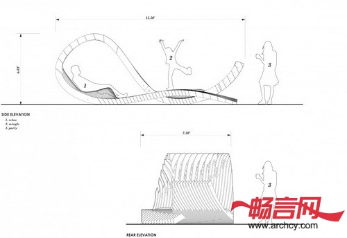 小亭的形状由一组连续的板条构成,它并尽可能地减少与地面的接触。根据功能的不同,板条的密度是根据三个不同用途设计的:板条密度最大的地方用于行走和坐卧;板条密度居中的地方被设计成靠背;板条最稀疏的地方则用于遮阳。这个凉亭大约15.5英尺长,7.58英尺宽,6.83英尺高,是一个人们休息和放松的宜人小建筑。