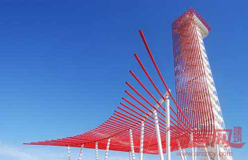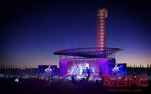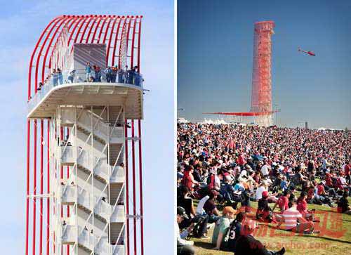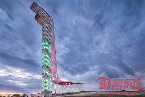 项目最引人瞩目的部分是一个250英尺高的钢架瞭望塔,观众可以从空中俯瞰场地以及附近的城市风景。18根红色金属管从瞭望塔上端向下延伸,成为可容纳15000名观众的露天剧场的顶棚。这个醒目顶棚成为了赛道标志,剧场可以常年承办各种社会活动。