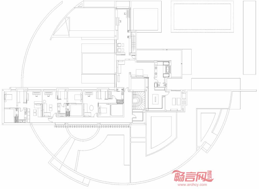 为了满足这一要求,DAHL&GHG建筑事务所将房间布局处理成十字形的平面,周边是半圆形的院墙。