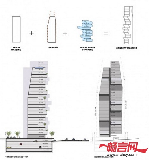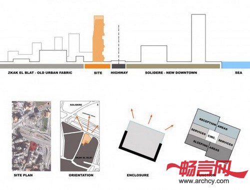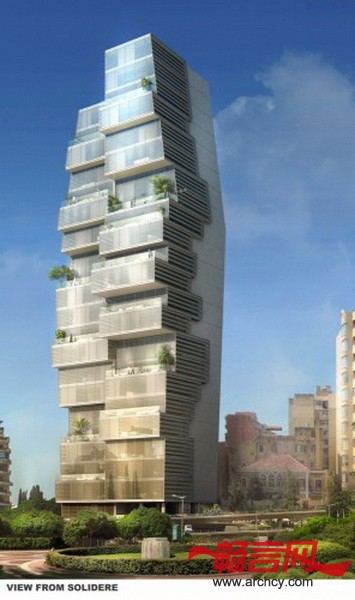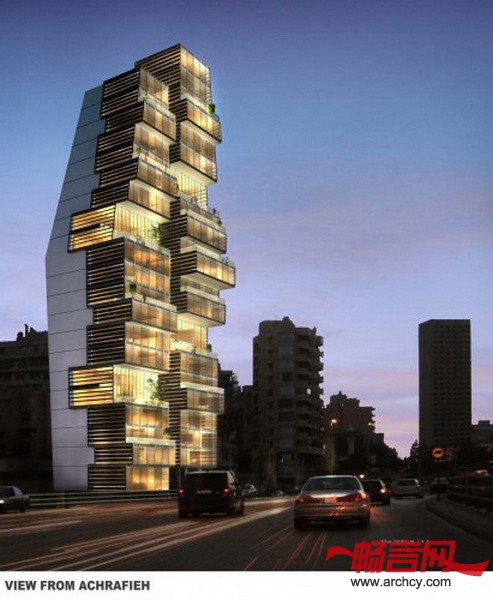 该项目毗邻贝鲁特的城市交通要道,坐落于两条城市道路的交叉点,它的设计是住宅规模、建筑元素多样性、最佳视野和良好布局的集合体。建筑的每个部分像一个个玻璃盒子一样向上叠加起来,这样最大限度地增加了住宅的可建面积。