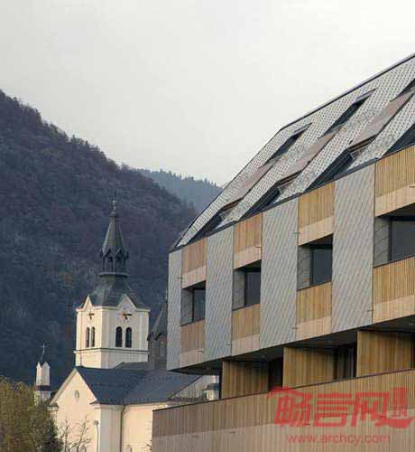 建筑坡屋顶上覆盖了灰瓦板,同时延伸到部分墙面上,保护覆盖区域不受强风或降雪损害。
