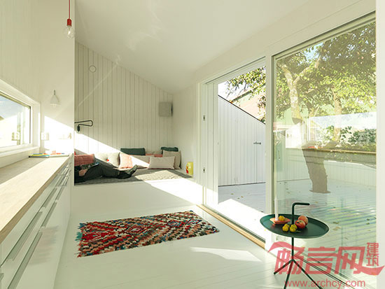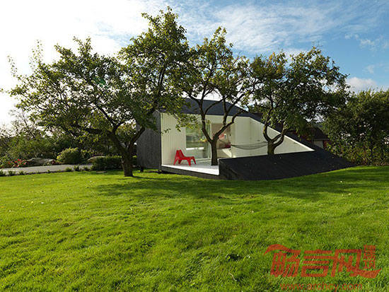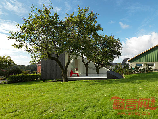 Saunders建筑事务所完成了位于挪威Haugesund的Slice住宅设计。项目仅有15平米,是在经济衰退期建造的。业主希望有一个安静的空间,享受休闲时光,欣赏宁静的花园景色。项目建造受场地条件制约,构成三角形建筑造型。露台前伸,腾出空间创造较大的房间。项目设计融入了景观之中,保护已有设施,古老的梅子树自由生长在户外露台旁边。