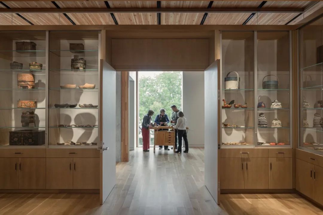 受挪威文化启发的建筑形式,Commons 的设计借鉴了挪威文化元素。迎宾顶篷提供了一个受保护的、醒目的入口,其设计灵感来源于著名的船只设计,包括来自里瑟尔的 Colin Archer 号船和 1825 年首次登陆美国的 Restauration 船。木质框架和混凝土基座让人想起挪威传统仓库“stabbur”的石基。混凝土纹理的灵感来自挪威国家政府大楼(又称 Y 型大楼)的建筑师 Erling Viksja 的作品,内部的穹顶类似于萨米人的帐篷,被称为“Lavvu”。新建筑的公共接待大厅和活动空间以高耸的木质顶棚为标志,与周边公园舒适而隐蔽的室外房间相映成趣。灵活的上层画廊,包括最先进的设施和一个新的数字制作工作室,为游客提供了探索丰富的文物和艺术品收藏的空间。