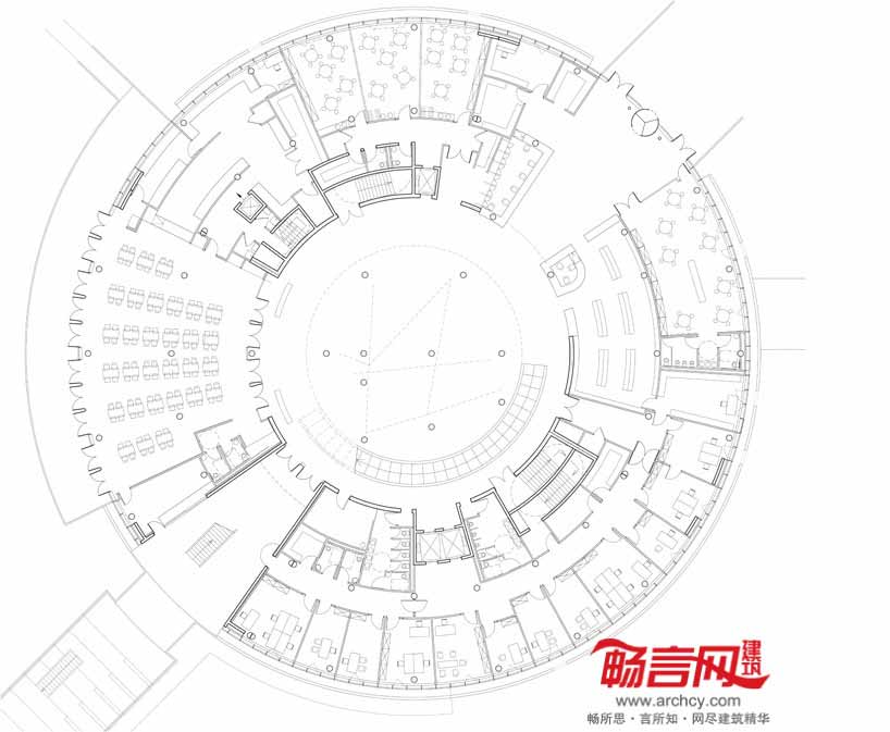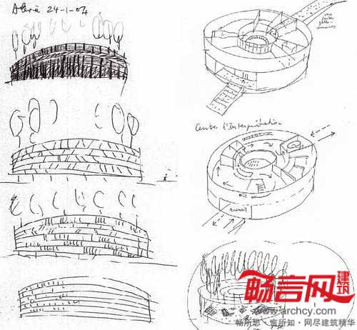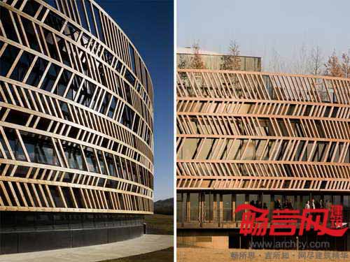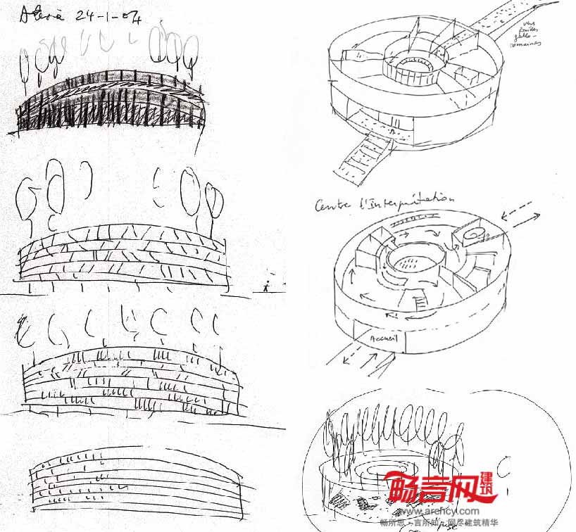 导览中心的主建筑由经纤细斜柱支撑的混凝土板构成。剪力墙组成了外部结构和螺旋上升的楼梯。水平方向的木质圆环以及间隔的斜木柱包围了整个外立面,使建筑和地面结合起来。圆形的设计使人们可以360度眺望场地;从屋顶的空中花园也可以俯瞰修复的古战场。相比之下,博物馆会展现真实的文物,而其外层将填入石块的石笼网,表达出高卢人在战争中的防御属性。
